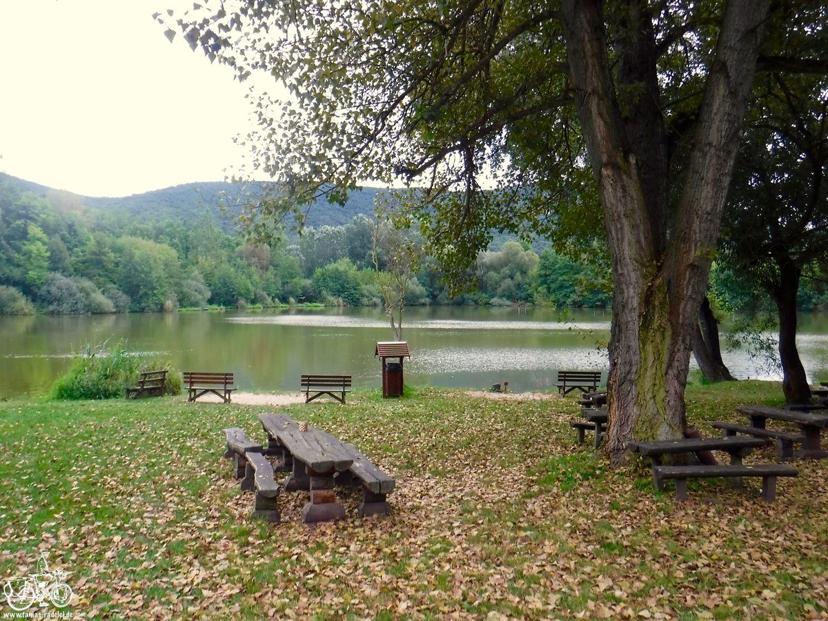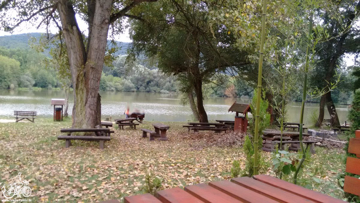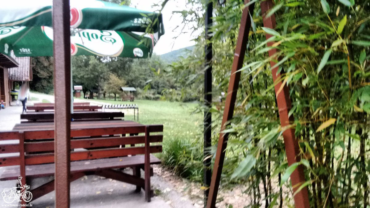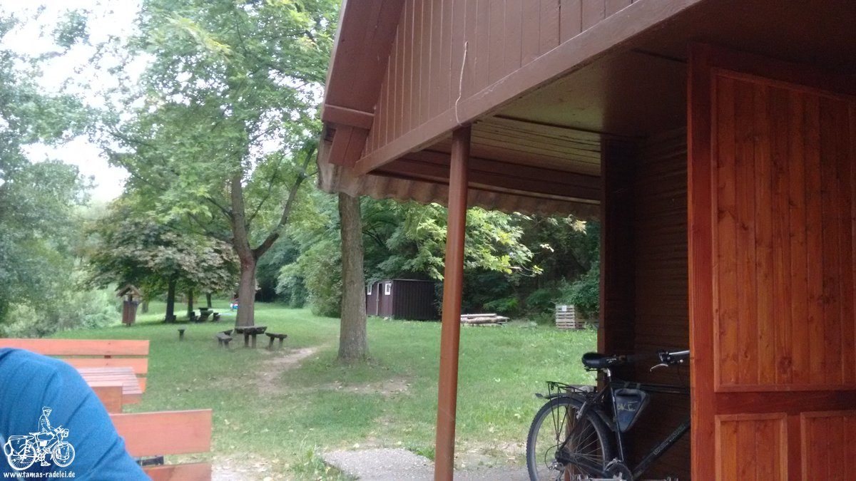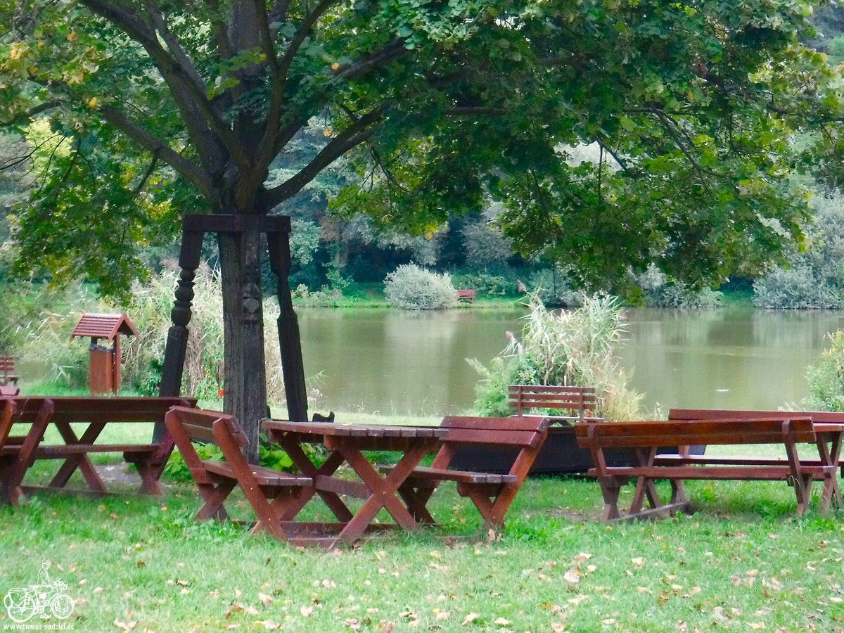 Also eingecheckt. Mein Radel blieb draußen, aber angeschlossen. Didi nahm seinen Flitzer gefaltet mit hoch aufs Zimmer. Nach dem Frischmachen, Wäschewaschen und Aufhängen ging es nochmals vor die Hoteltür, denn es hatte sich wieder etwas stabilisert und Hunger bekamen wir auch und wir wollten auswärts Abendbrotessen gehen. Laut Navi-App hätte es nebenan eine Gaststätte geben sollen, die sah aber zuer als zu aus. Also weitergesucht auf der Navi-App-Karte und einen Imbiss an einem Teich in 1,5 km Entfernung gefunden. Also diesen angesteuert, unterwegs vorsichtshalber die Einwohner gefragt und diesen auch gefunden. Wir waren die letzten Gäste für diesen Tag und genossen das Bohnengulasch bzw. die Putenbrust nebst Getränken und Eis zum Nachtisch – irgendwoher müssen ja die Kalorien wieder herkommen 🙂 Ein wirklich sehr idyllisches ruhiges Fleckchen, an dem ich gerne mein Zelt aufschlagen würde, was leider dort aber nicht möglich / erlaubt ist.